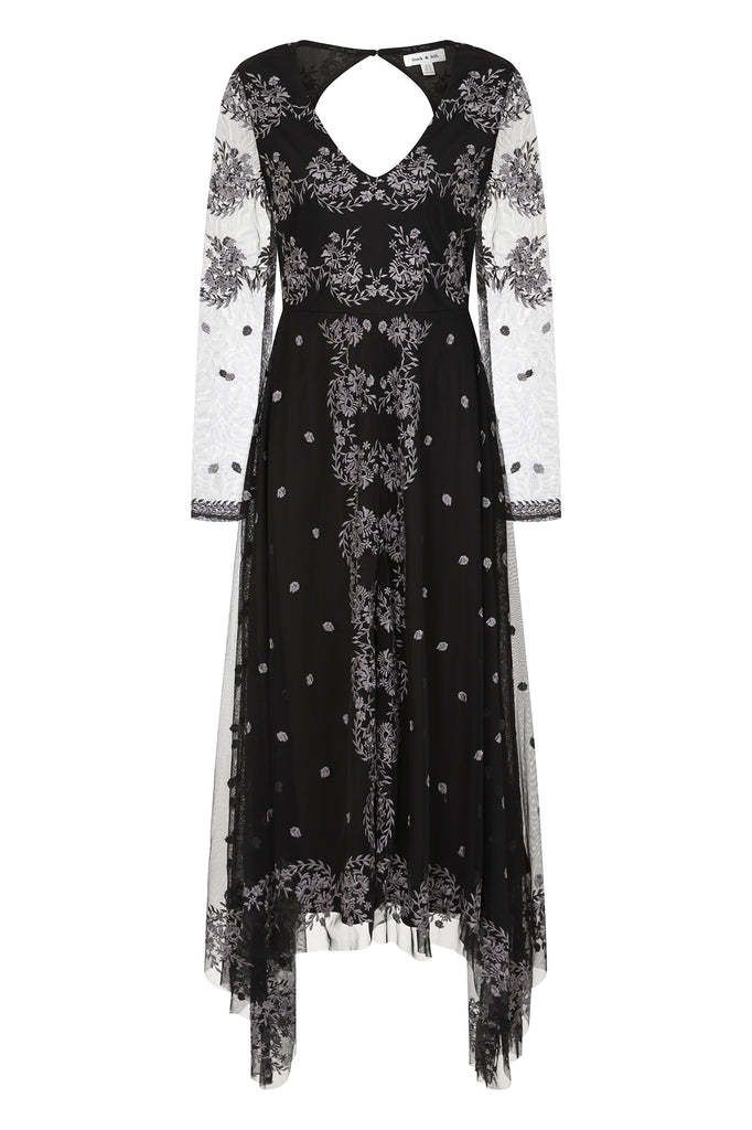 Designed with attention to detail, this dress features soft grey embroidery throughout in a vintage-inspired floral pattern. Designed in a relaxed silhouette, the V-neck bodice contrasts with the slightly flared skirt, which falls to a mid-rise handkerchief hem. It features long, sheer sleeves and cut-out detailing at the back.